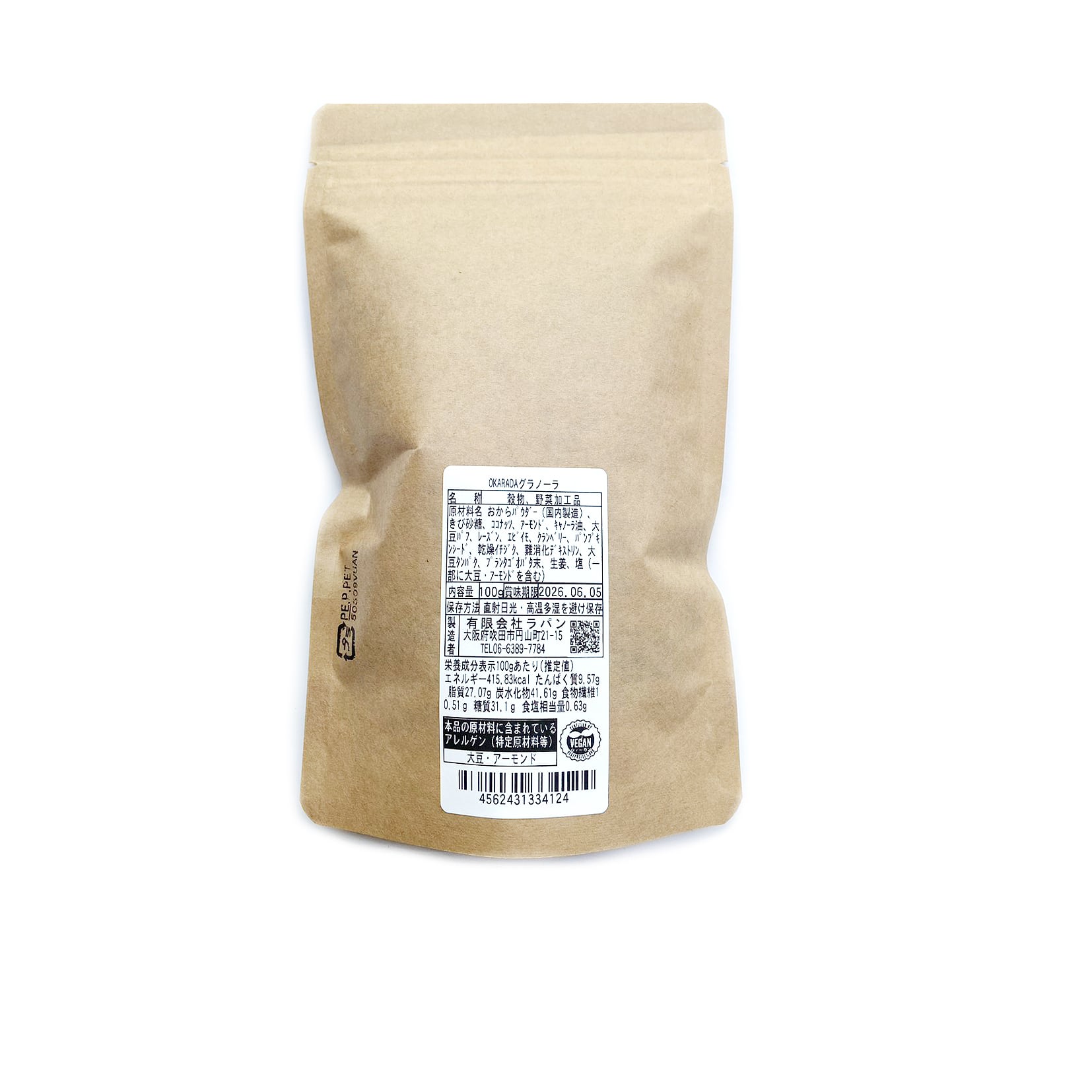 おからパウダー(国内製造)、きび砂糖、ココナッツ、アーモンド、キャノーラ油、大豆パフ、レーズン、くるみ、クランベリー、パンプキンシード、乾燥イチヂク、難消化デキストリン、大豆たんぱく、プランタゴオバタ末、生姜、塩(一部に大豆・くるみ・アーモンドを含む)